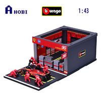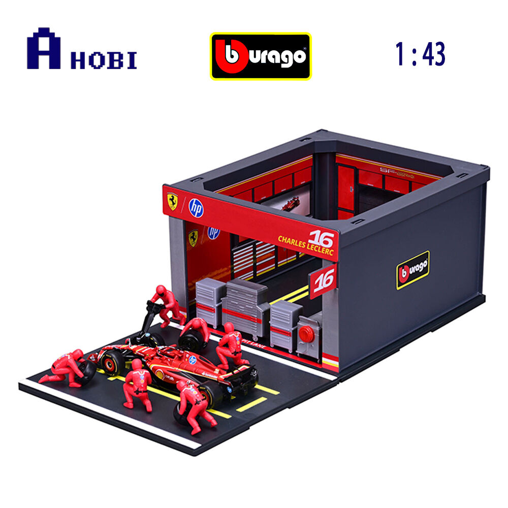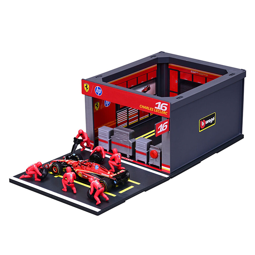 • Realistic diorama with pit stop, paddock, 6 Ferrari mechanics and the diecast model SF-24 #16