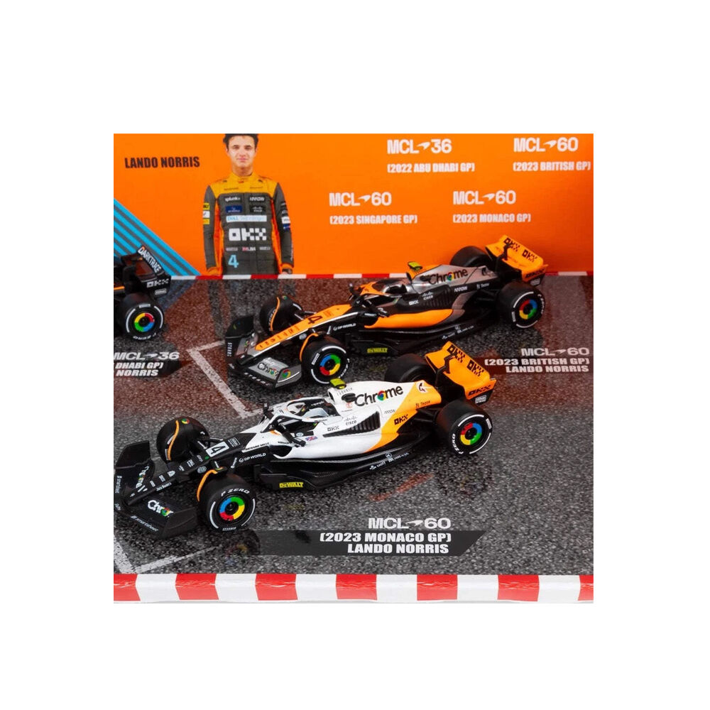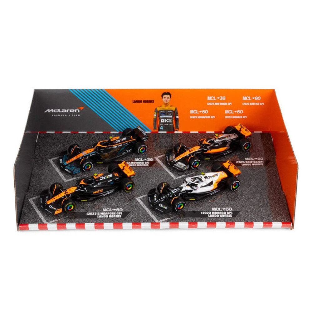 • The set includes detailed replicas of four distinct cars, each representing significant races or achievements in Norris' time with the team