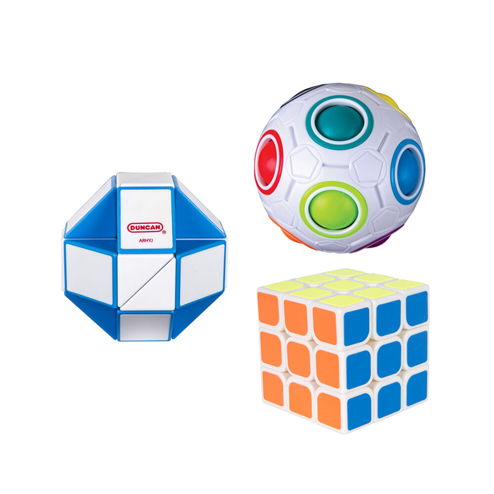 • The Duncan Toys Brain Game set includes Quick Cube 3x3, Serpent Snake Puzzle and Color Shift Puzzle Ball