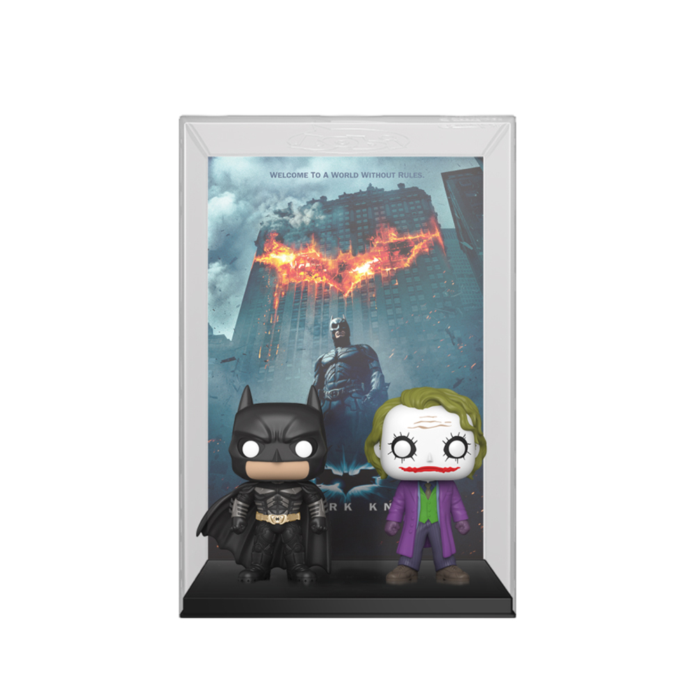• The Batman: The Dark Knight POP! Movie Poster Figure with Case includes POP! Vinyl Figures of both Batman and Joker, a backdrop of the famous film's poster