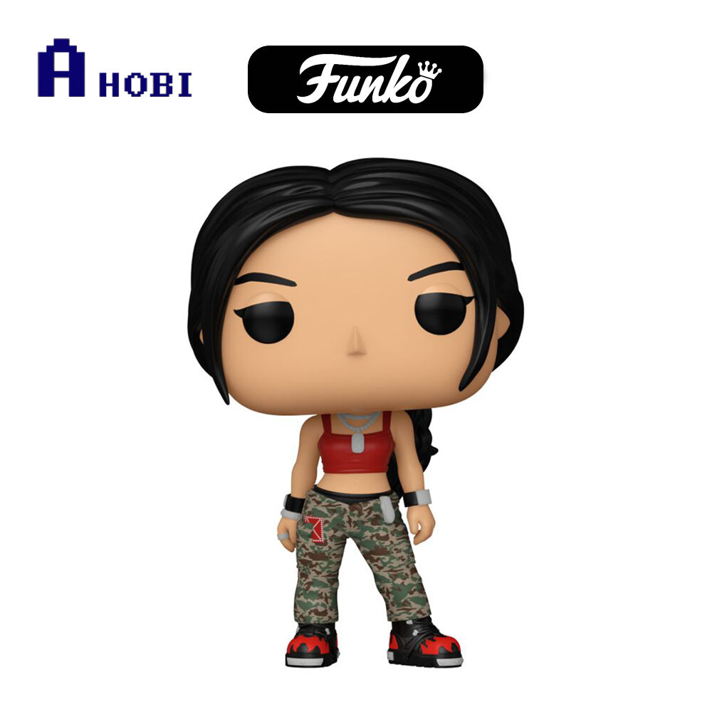 • She's dressed in a red cropped tank top, camo pants, and black-and-red sneakers, with wristbands on both arms and a small silver pendant at the neck.The pants feature printed patches on the thighs, including a red "X" detail on one leg