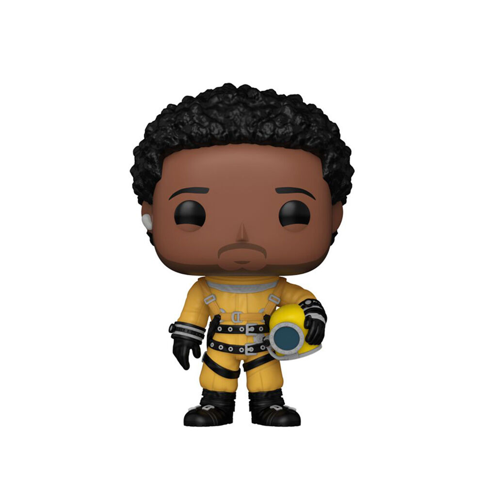 • The POP! figure shows him standing upright in a yellow jumpsuit with a gray harness and belt details, plus black gloves and boots
