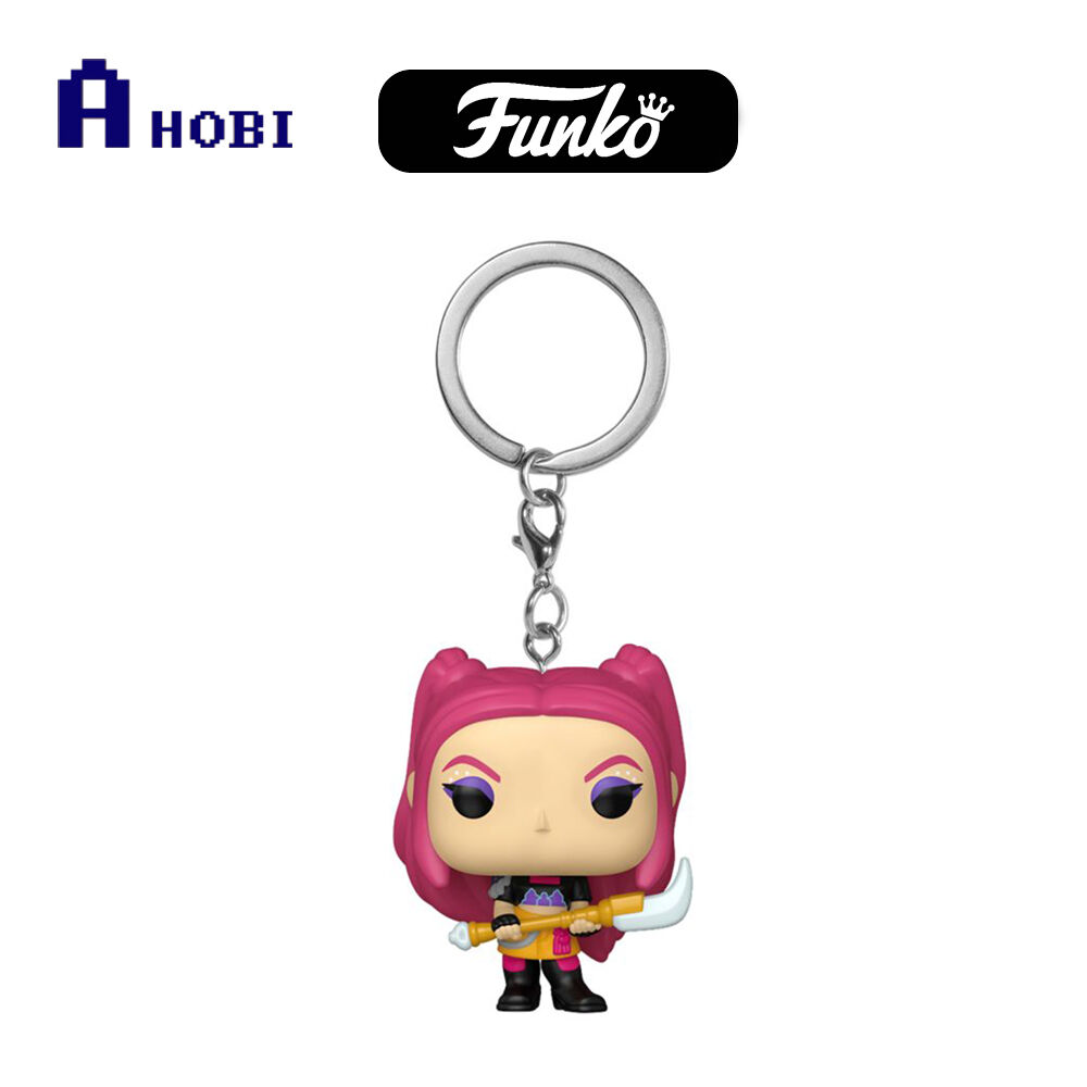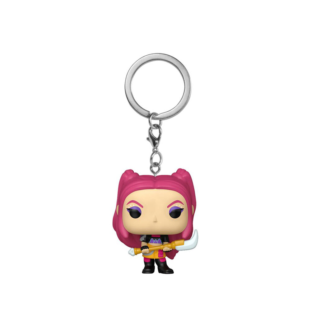 • This pocket Pop! keychain shows a stylized figure with bright pink hair and a focused expression