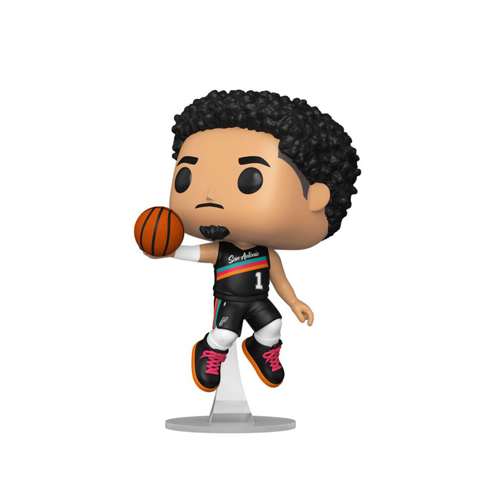 • Details include curly black hair, white wrist tape. He wears a black jersey with "San Antonio" across the chest and a rainbow stripe detail, plus matching shorts with the number 1 visible