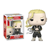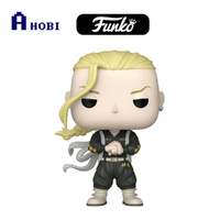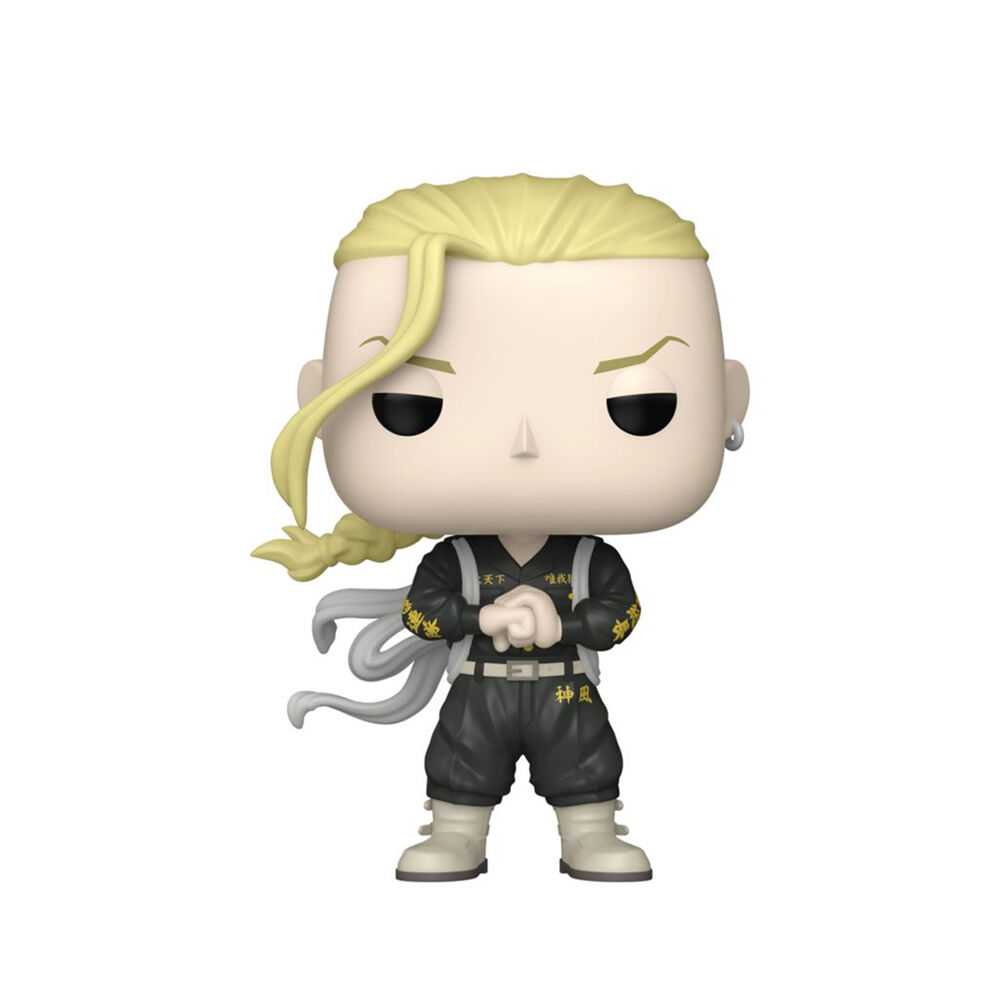 • The Funko POP! figure shows him standing with arms folded, wearing a black uniform covered with small gold markings and a light belt at the waist