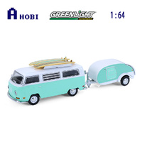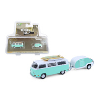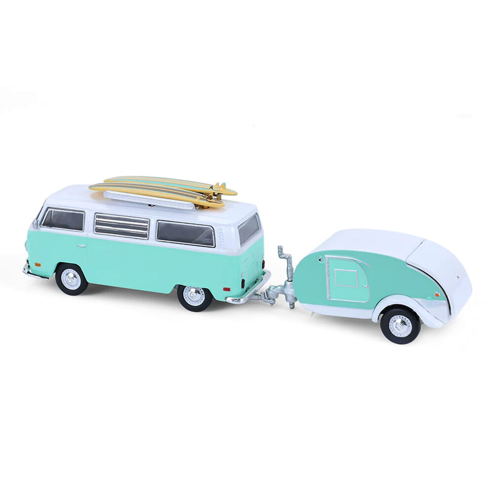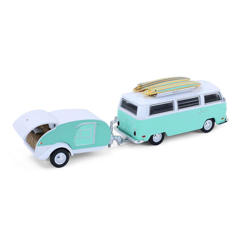Greenlight 1:64 Scale Hitch & Tow Series 33 - 1971 Volkswagon Type 2 With Surfboards And Teardrop Trailer Model