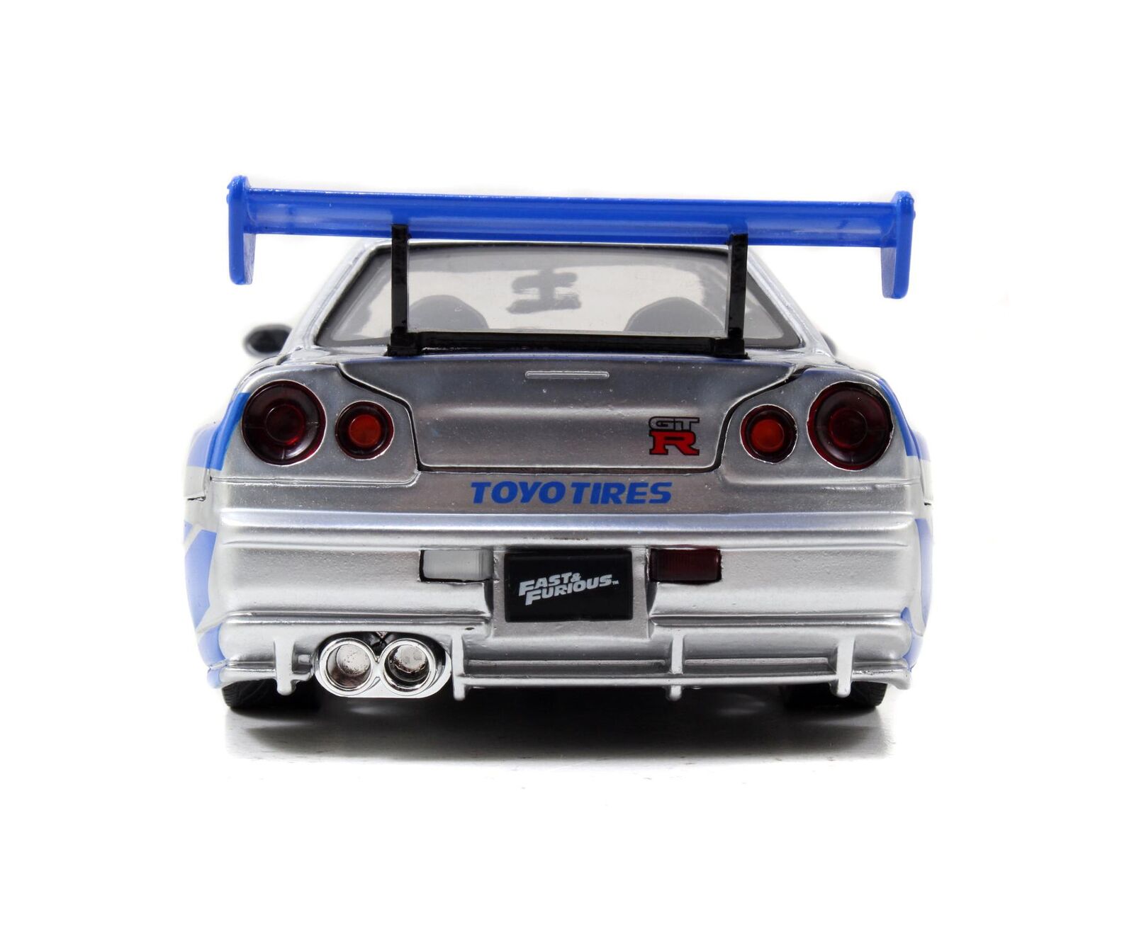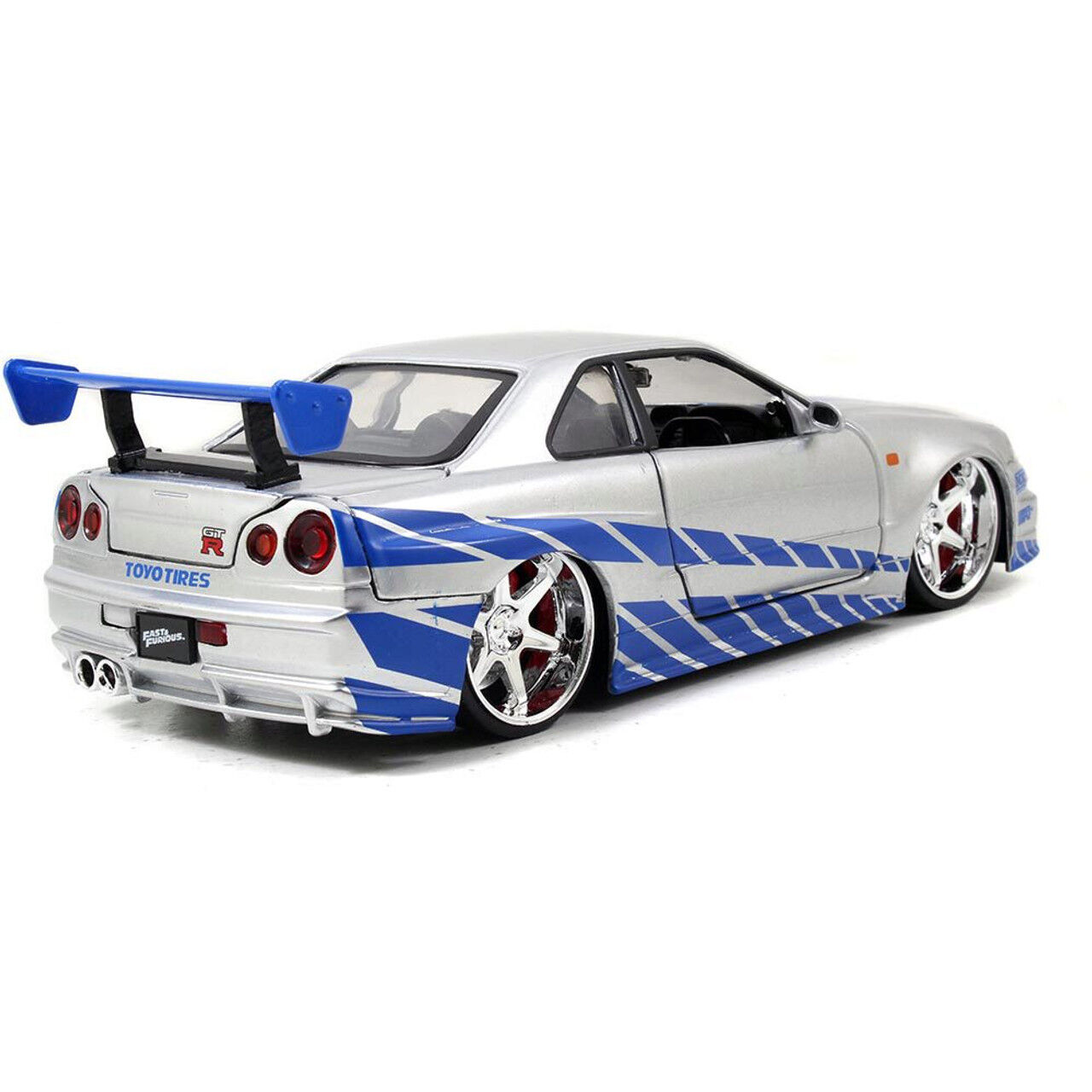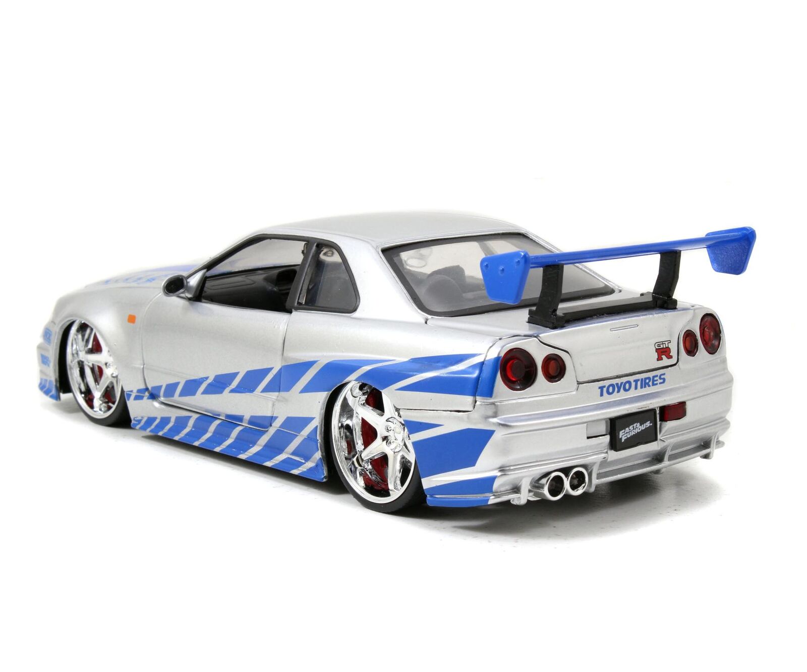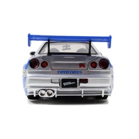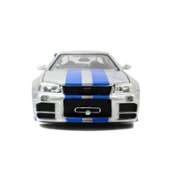 • Brand new 1:24 scale Brian's Nissan GTR Skyline R34 RHD (Right Hand Drive) Silver with Blue Stripes "Fast & Furious" Movie diecast model car by Jada