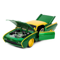 • Loki's bright green and gold chromed ride features premium paint and wheel rims as large as his ego
