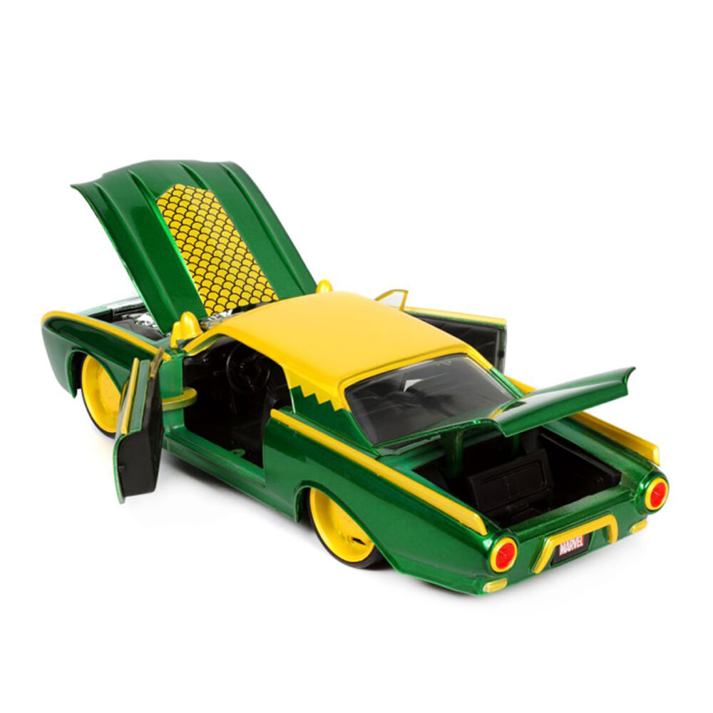 • Opening doors, hood, trunk, and a detailed interior accompany a die-cast Loki figure wearing his signature horns