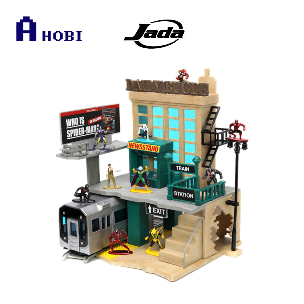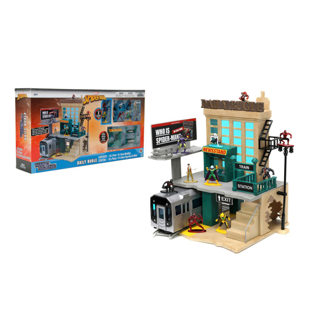 • The Daily Bugle Nanoscene is unique and offers a novel way to display all your favorite characters with; five levels, evocative NYC street scenes including fire escapes, lamp posts, a newsstand, and a subway train complete with the track