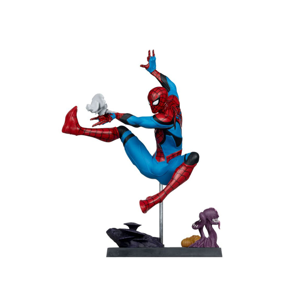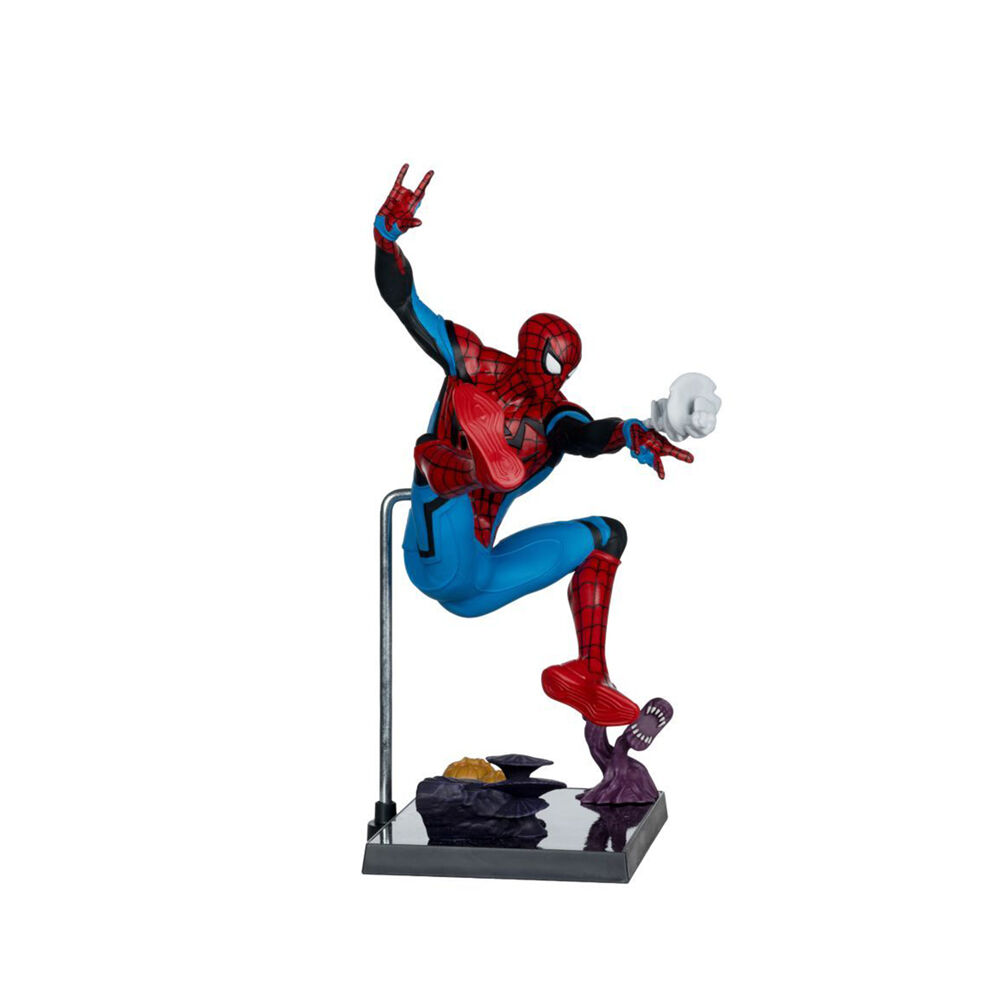 • Spider-Man is seen in an action-packed mid-swing pose, firing the web spinner on his left hand