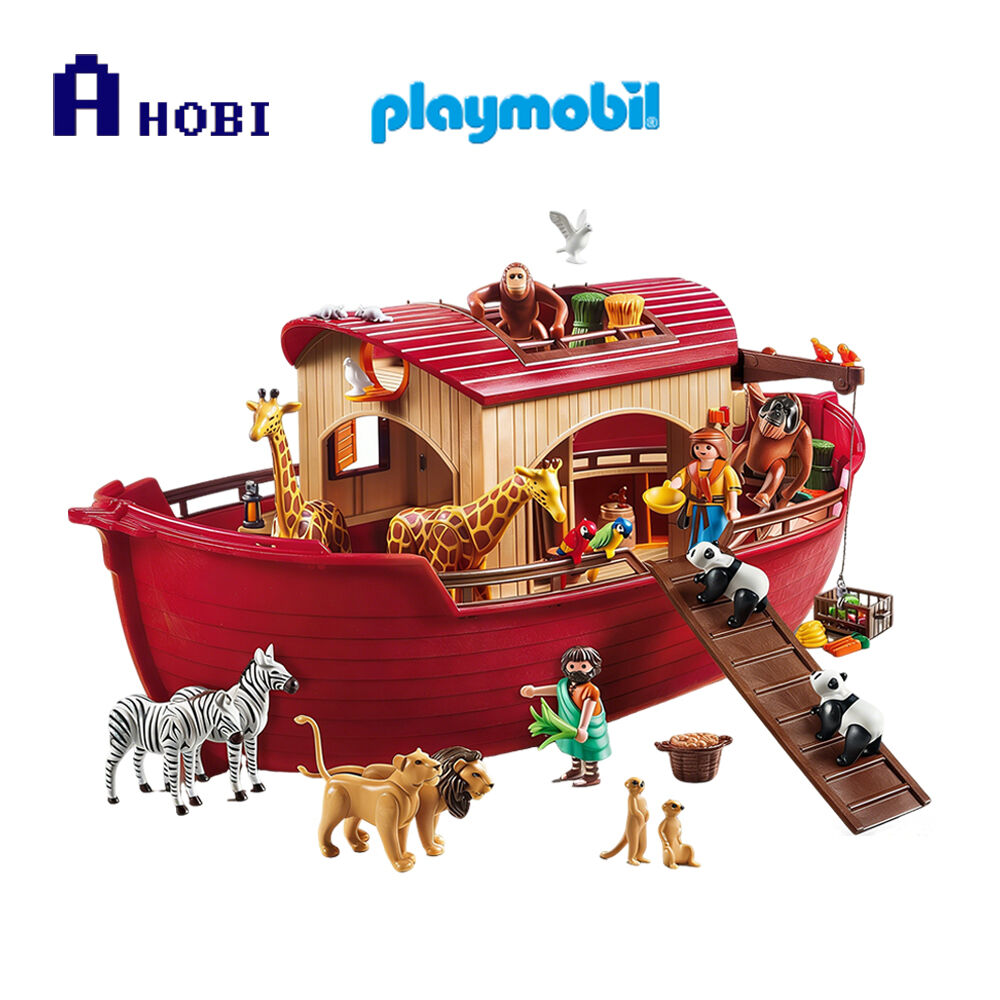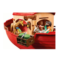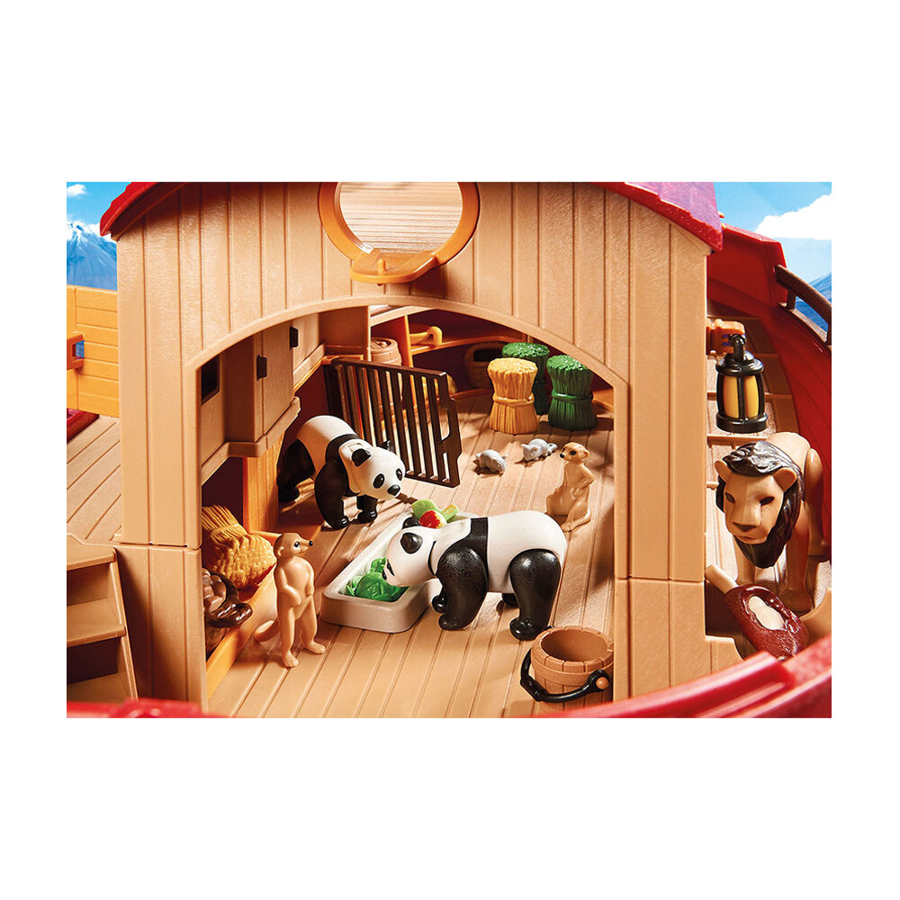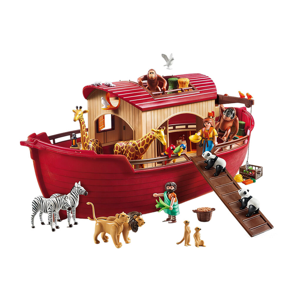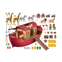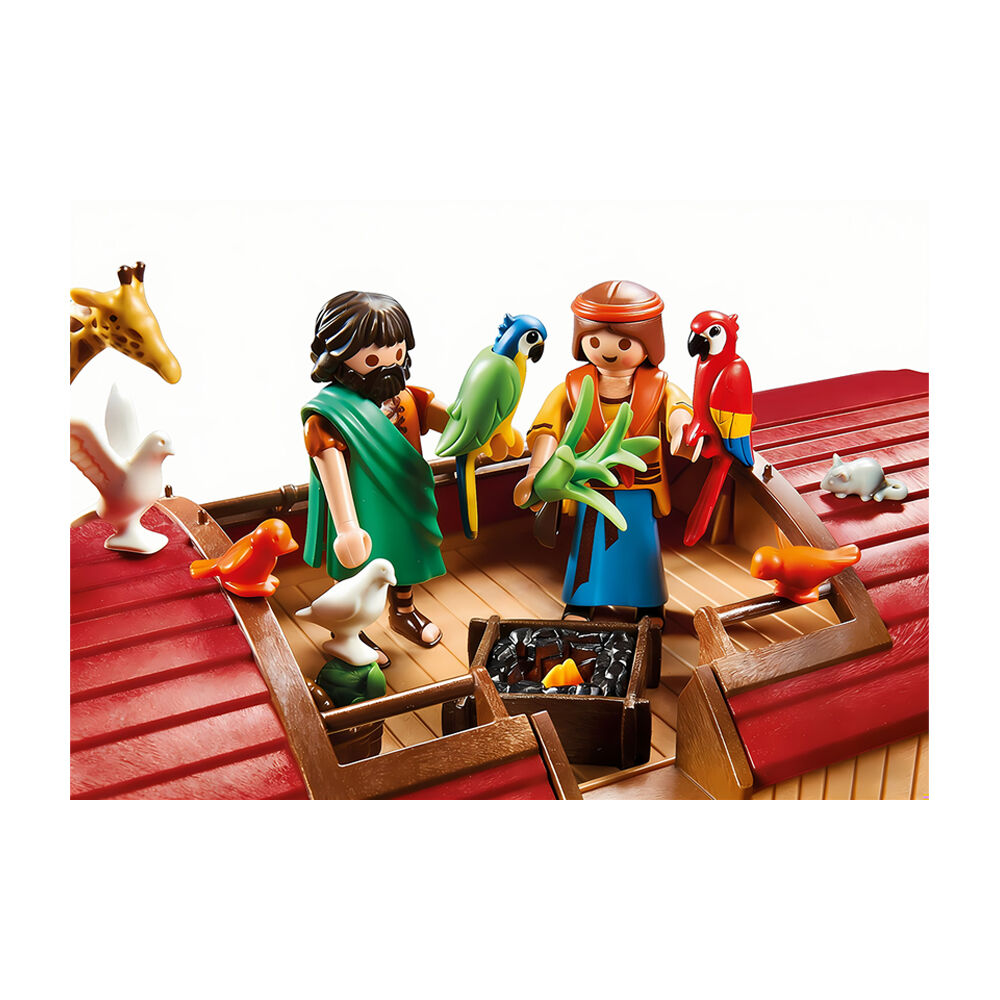 • It includes figure: 1 x woman, 1 x man , 2 x giraffes, 2 x pandas, 1 x standing meerkat, 1 x sitting meerkat, 1 x sitting bird, 1 x pecking bird, 2 x mice, 1 x lion, 1 x lioness, 2 x zebras, 1 x male orangutan, 1 x female orangutan, 2 x parrots, 1 x flying dove, 1 x standing dove ; accessories: 1 x ark, 1 x lantern, 1 x fireplace, 1 x trough, 1 x bowl, 1 x barrel with tap, 1 x box, 1 x basket with potatoes, 1 x picnic basket, 1 x jar, 1 x bucket, 2 x straw beds, 2 x bundles of hay, 2 x bundles of grass, 1 x grass, 2 x apples, 1 x banana, 2 x carrots, 1 x red cabbage, 1 x salad, 2 x meats, 1 x stick, 1 x pitchfork, 1 x broom, 1 x headband, 1 x belt bag