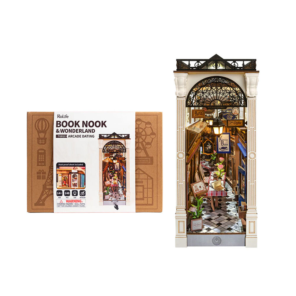 • Press the button on the bottom of the book nook to turn on the lights, There are three glowing lamps powered by two AAA batteries (batteries not included)