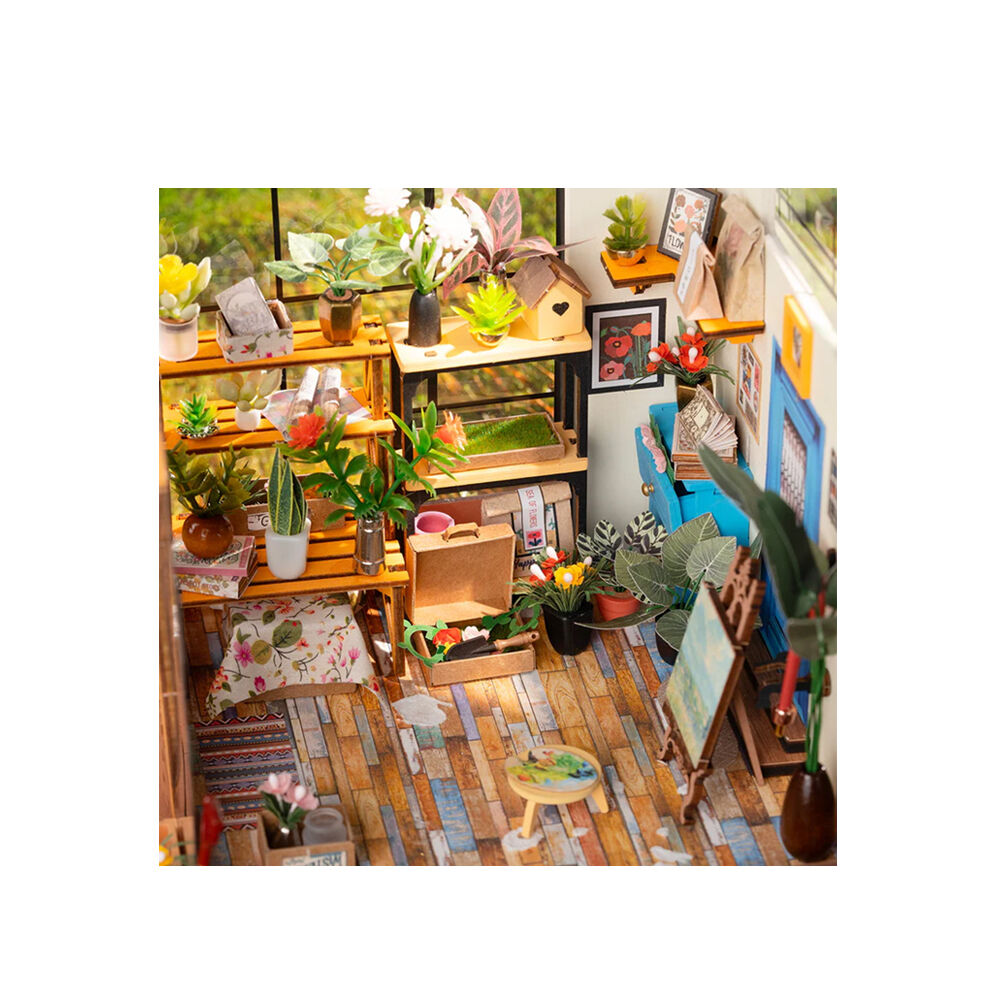• With so many cute little plants, flowers, vases, flower racks, slatted crates, wooden cabinets, paper boxes, photo frames, spades, brooms, paintings, etc., this flower house will make you smile whenever you see it