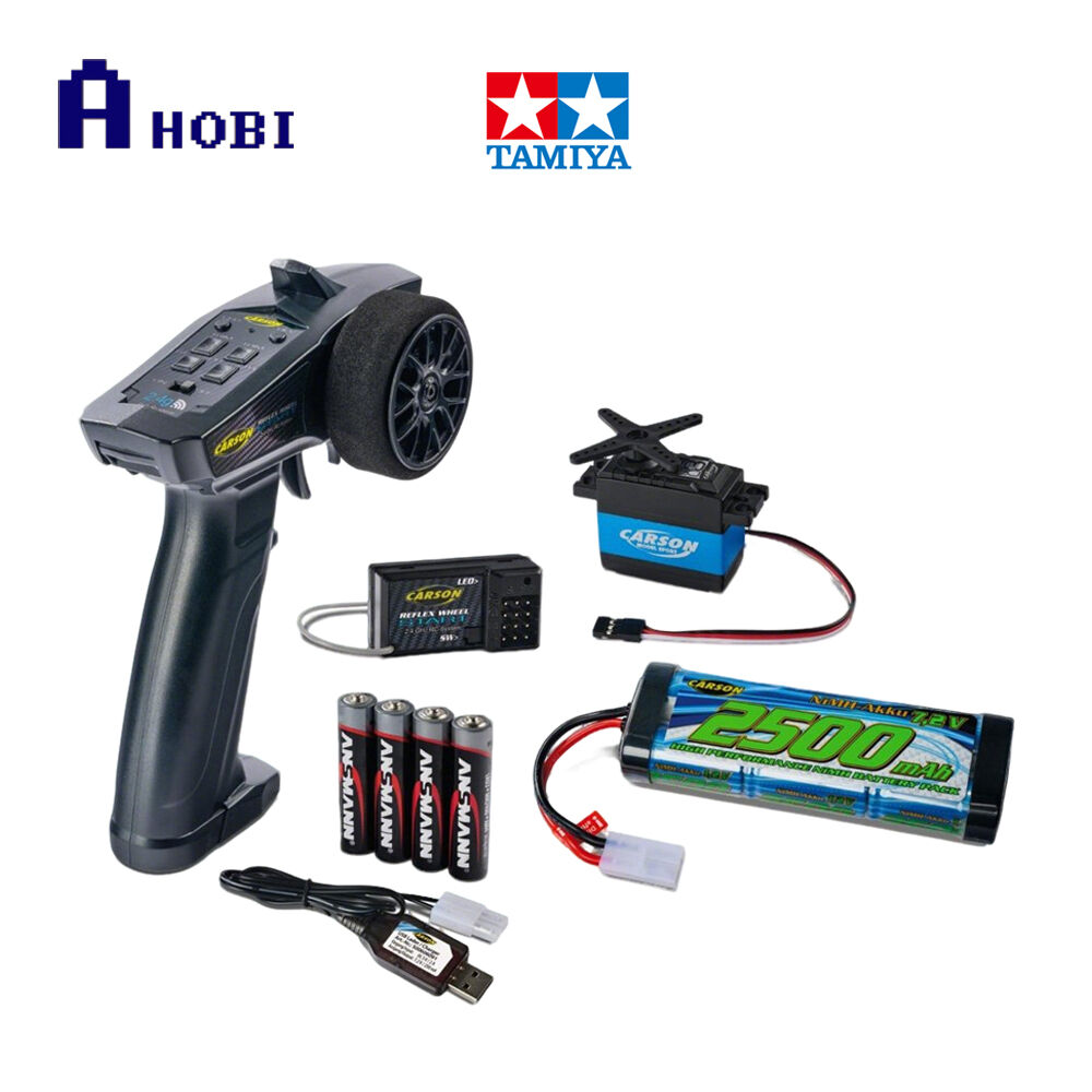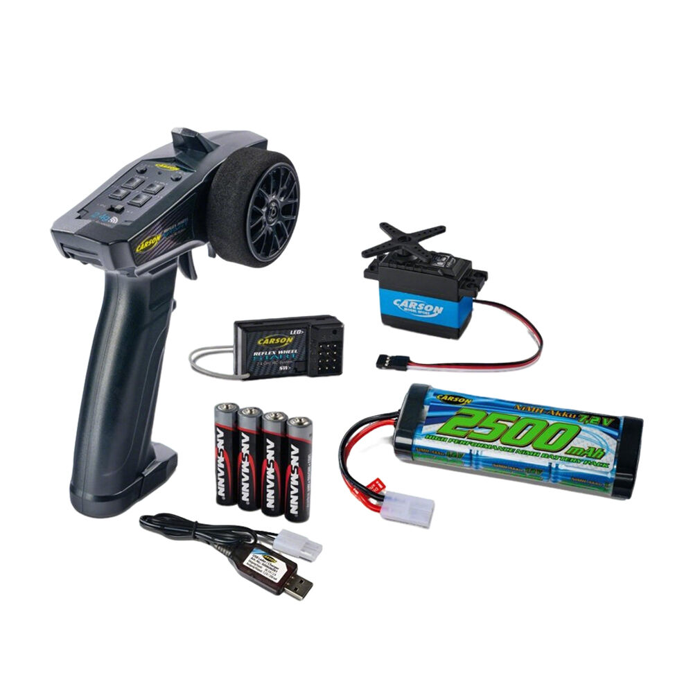 • It includes: 3-channel 2.4GHz transmitter with trimming functions; 3-channel mini receiver; CS-3 steering servo; 7.2V/2500mAh NiMH drive battery; USB charger; 4 x AAA batteries