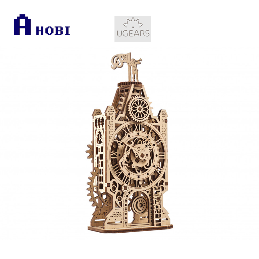 • This beautiful DIY wooden clock tower model is a mechanical mechanism in the form of a tower with clock face, moving gears, a moving pendulum, whimsical characters, and a weather vane on top